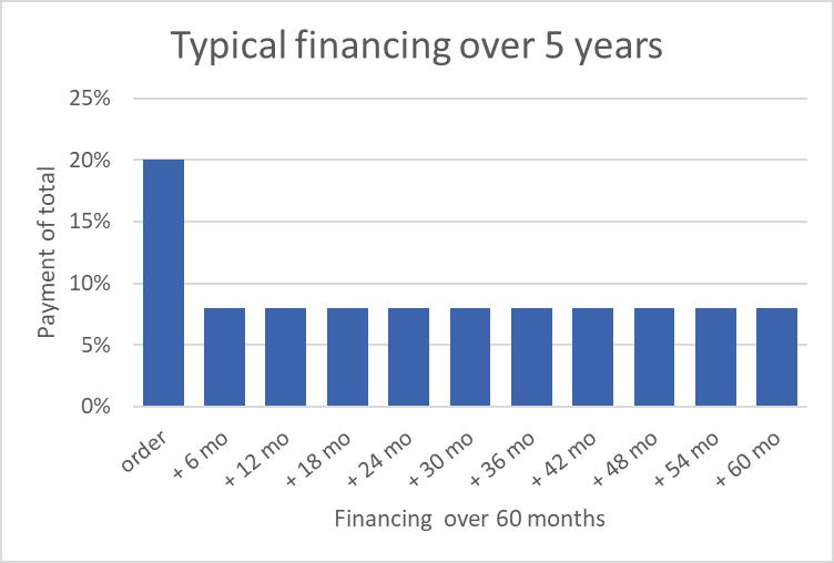 A project financed over 5 years will have an initial payment of 20% at order and 10 bi-annual payments.
