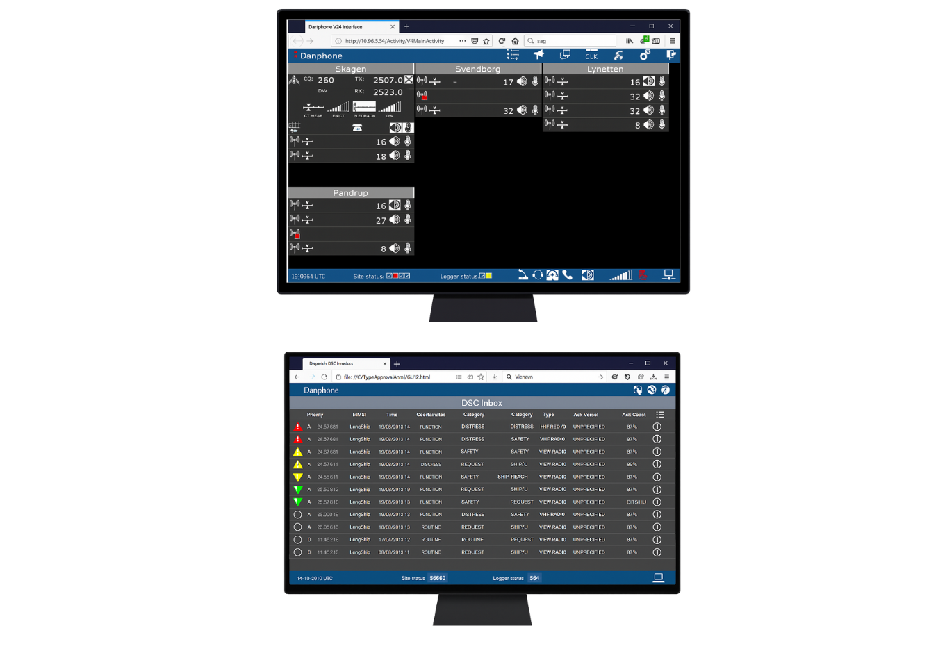 Danphone GMDSS coast stations for VHF and MF/HF are delivered in compliance with relevant IMO and ITU specifications, including DSC, voice and data logging, and interface with landline telephones. The system features IP-network infrastructure, Voice over IP and remote control via touch monitors.